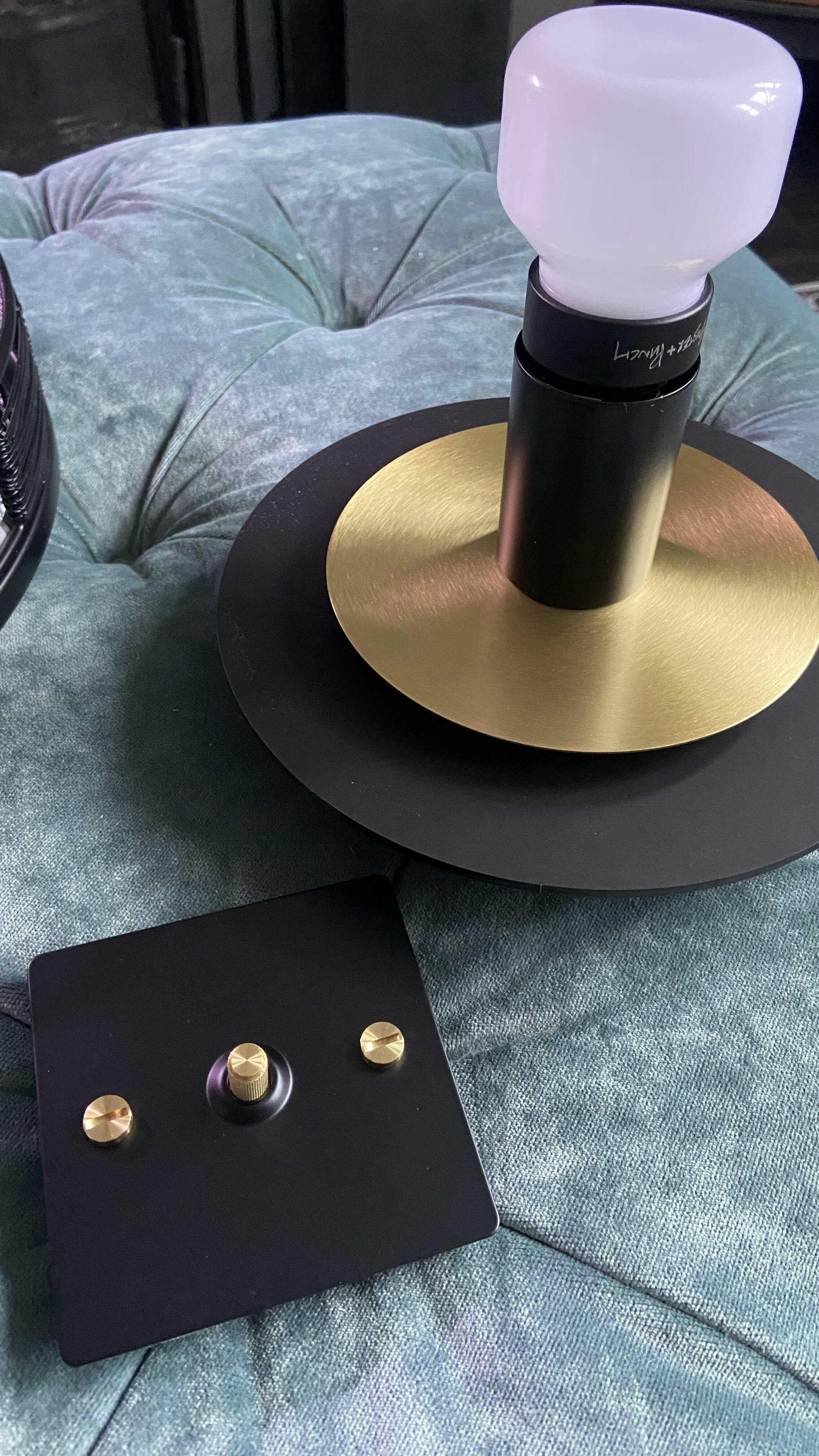 The Black "Aureole" is a classy version of one of our most popular wall light. The two floating discs of brass and matt black perspex compliment each other, creating a beautiful statement light. This makes a beautiful wall light but can also be used as a ceiling light. There is also an option to add a button switch, for ease of use as a wall lamp.
